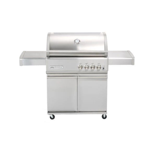 CROSSRAY Infrared 4 Burners, 4 x 11MJ/Hr, 304 Stainless Steel front & rear body panels, lid, shelves and trolley doors, Die cast aluminium side and end.