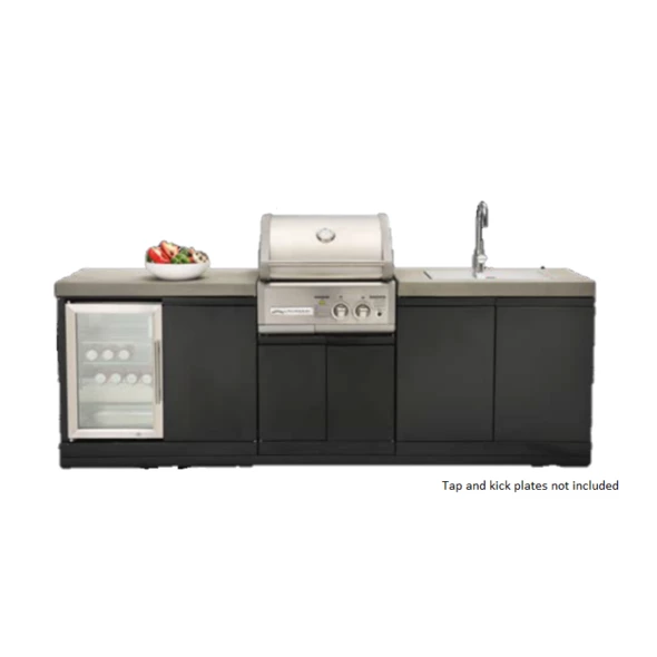 CROSSRAY Outdoor Kitchen with 2 Burner BBQ with double side cabinets, flat benchtops, single stainless steel fridge (63L), Crossray 304SS under-bench sink included -TC2K-04